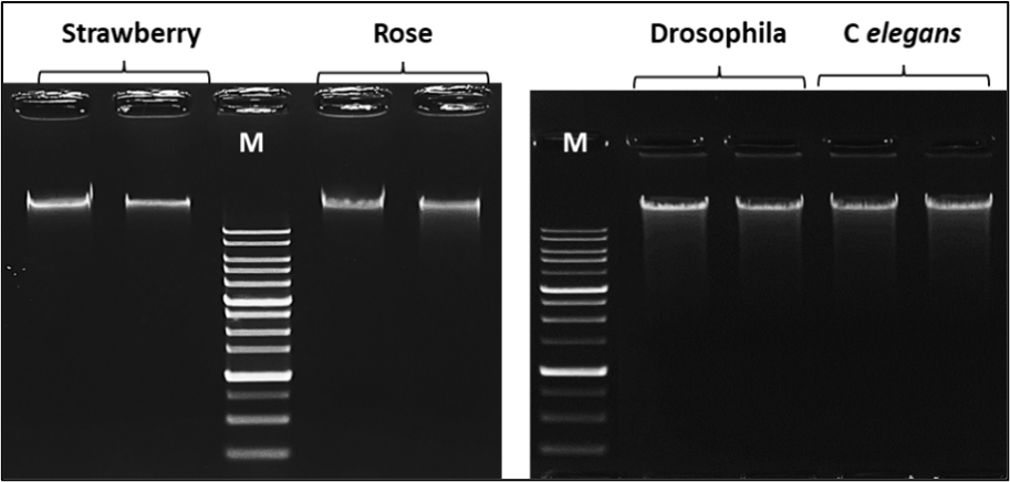 Figure B: DNA from plant and small organism samples extracted using the Next Advance Bullet Blender and extraction kits by Microzone. DNA from 30mg of strawberry and rose leaves and DNA from 50 mg of small organism samples was extracted and run on a 1% Agarose gel. M – 1 kb ladder.
